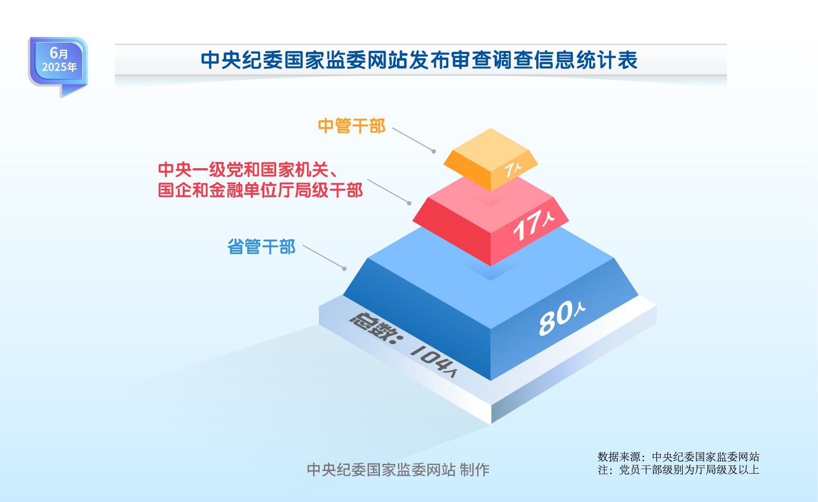 2025年6月,中央紀(jì)委國家監(jiān)委網(wǎng)站共發(fā)布104名黨員領(lǐng)導(dǎo)干部接受審查調(diào)查信息。其中,中管干部7人,中央一級黨和國家機(jī)關(guān)、國企和金融單位廳局級干部17人,省管干部80人。