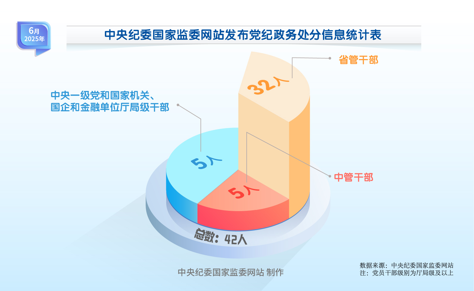 2025年6月,中央紀(jì)委國家監(jiān)委網(wǎng)站共發(fā)布42名黨員領(lǐng)導(dǎo)干部黨紀(jì)政務(wù)處分信息。其中,中管干部5人,中央一級黨和國家機(jī)關(guān)、國企和金融單位廳局級干部5人,省管干部32人。