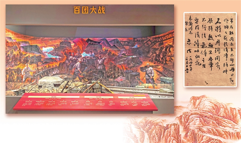 左圖為:“山河永固——晉冀魯豫抗日根據(jù)地革命文物展”呈現(xiàn)的百團大戰(zhàn)場景。 右圖為:朱德為左權(quán)犧牲寫的悼詩:名將以身殉國家,愿拼熱血衛(wèi)吾華,太行浩氣傳千古,留得清漳吐血花。劉同華 攝