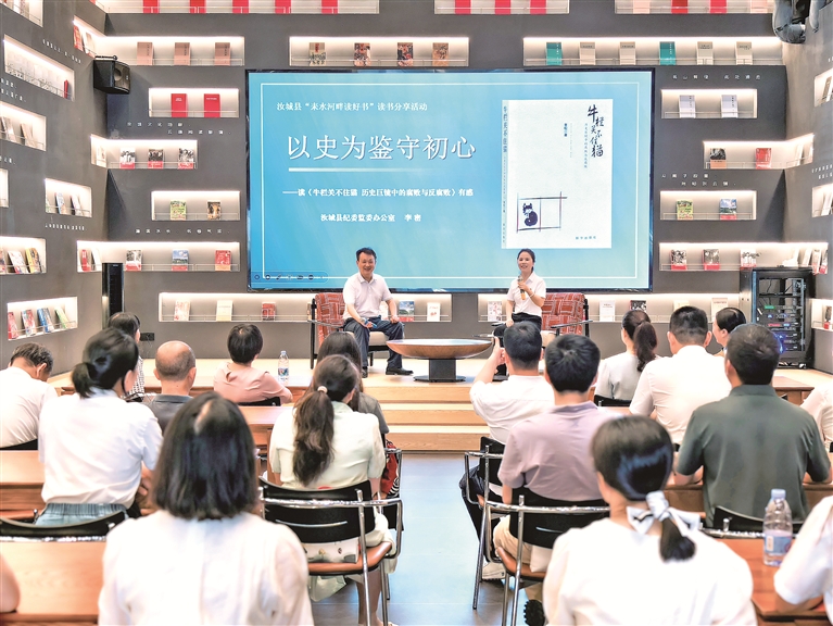 湖南省汝城縣紀委監委為進一步弘揚廉潔文化,涵育家庭文明風尚,聯合縣婦聯、縣文聯在濂溪云書院開展汝城縣“涵養清廉風 共筑家國夢”主題作品展暨“耒水河畔讀好書”學習分享活動。圖為該縣紀檢監察干部正在分享讀書體會。 朱桂花 攝