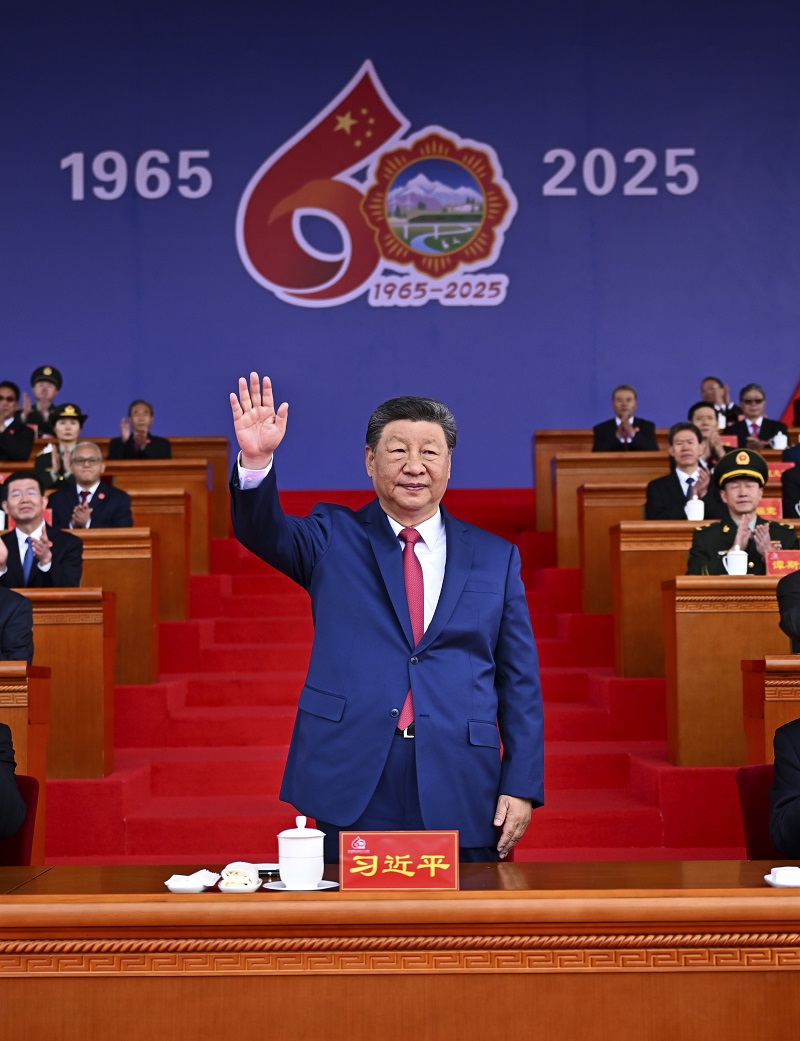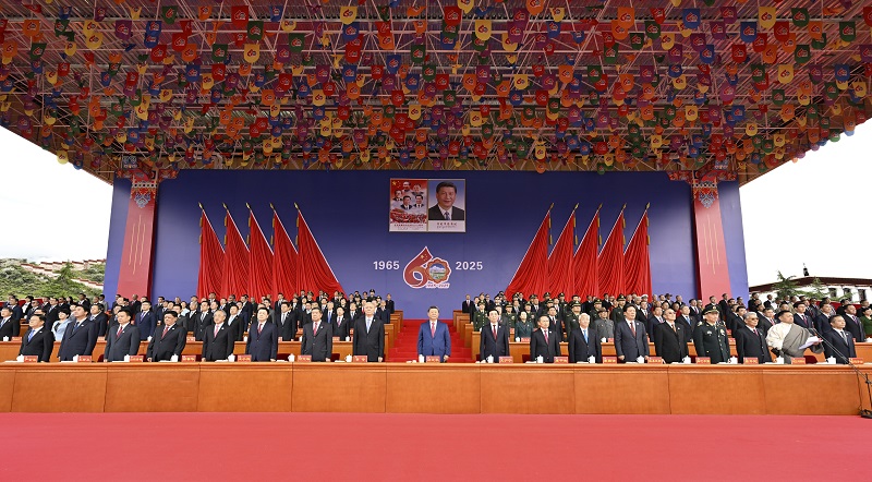 王滬寧發表講話。他說,1965年9月,在黨中央親切關懷和黨的民族政策光輝照耀下,西藏自治區宣告成立。這是西藏發展史上具有劃時代意義的大事,鞏固了西藏和平解放和民主改革的偉大成果,實現了西藏社會制度的歷史性跨越。60年來,西藏經濟社會全面發展,民族區域自治制度成功實踐,民族團結日益鞏固,各族人民生活蒸蒸日上,充分展現了中國共產黨領導的堅強力量,充分展現了我國社會主義制度的顯著政治優勢。