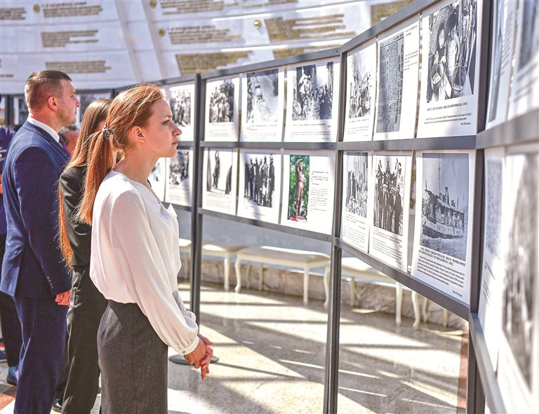 定格共同的勝利,重溫跨越時空的二戰記憶?!般懹洑v史 開創未來”——紀念中國人民抗日戰爭暨世界反法西斯戰爭勝利80周年圖片展正在白俄羅斯國立偉大衛國戰爭歷史博物館展出。圖為觀眾在參觀展覽。新華社記者 張超群 攝