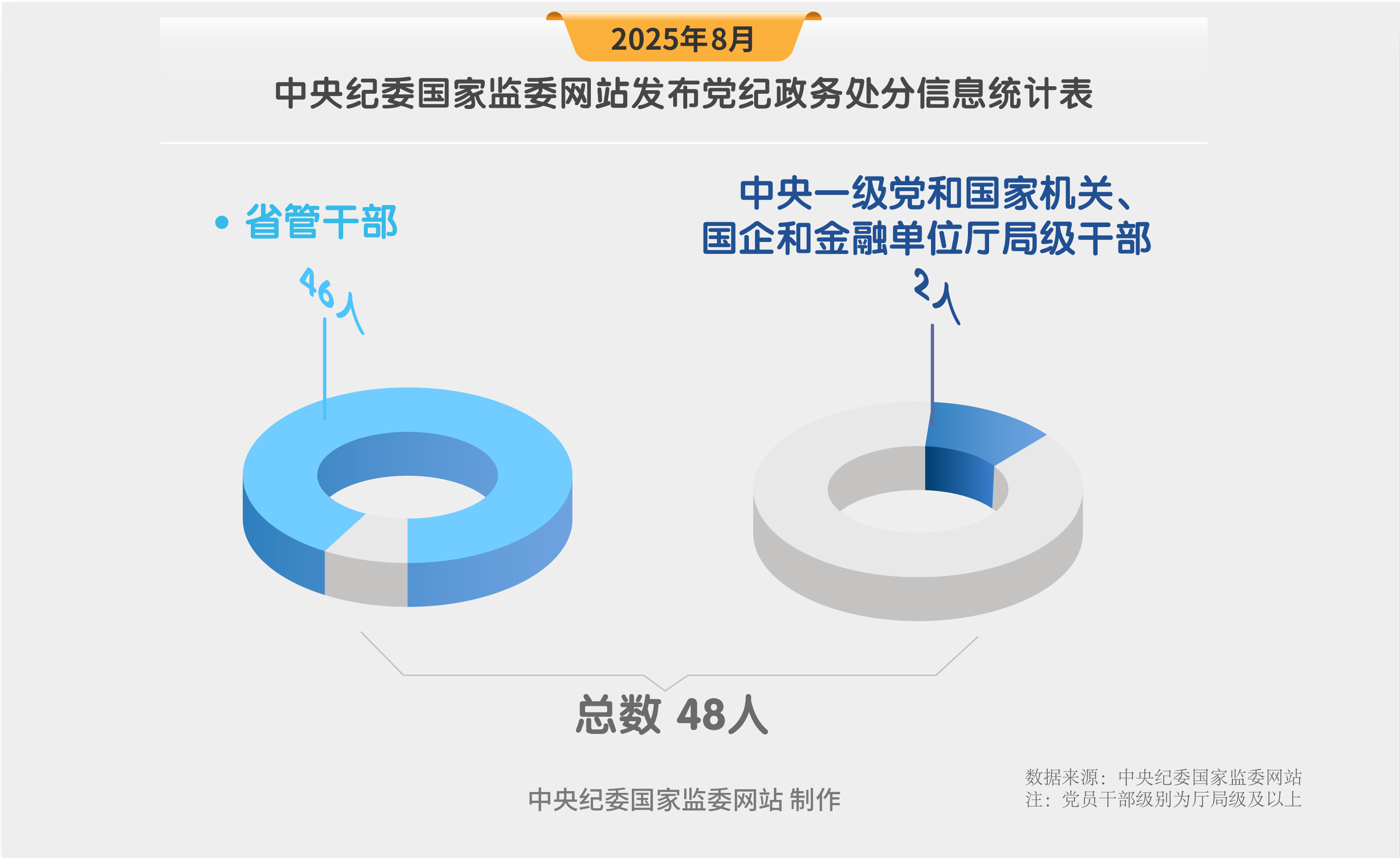 2025年8月,中央紀(jì)委國(guó)家監(jiān)委網(wǎng)站共發(fā)布48名黨員領(lǐng)導(dǎo)干部黨紀(jì)政務(wù)處分信息。其中,中央一級(jí)黨和國(guó)家機(jī)關(guān)、國(guó)企和金融單位廳局級(jí)干部2人,省管干部46人。