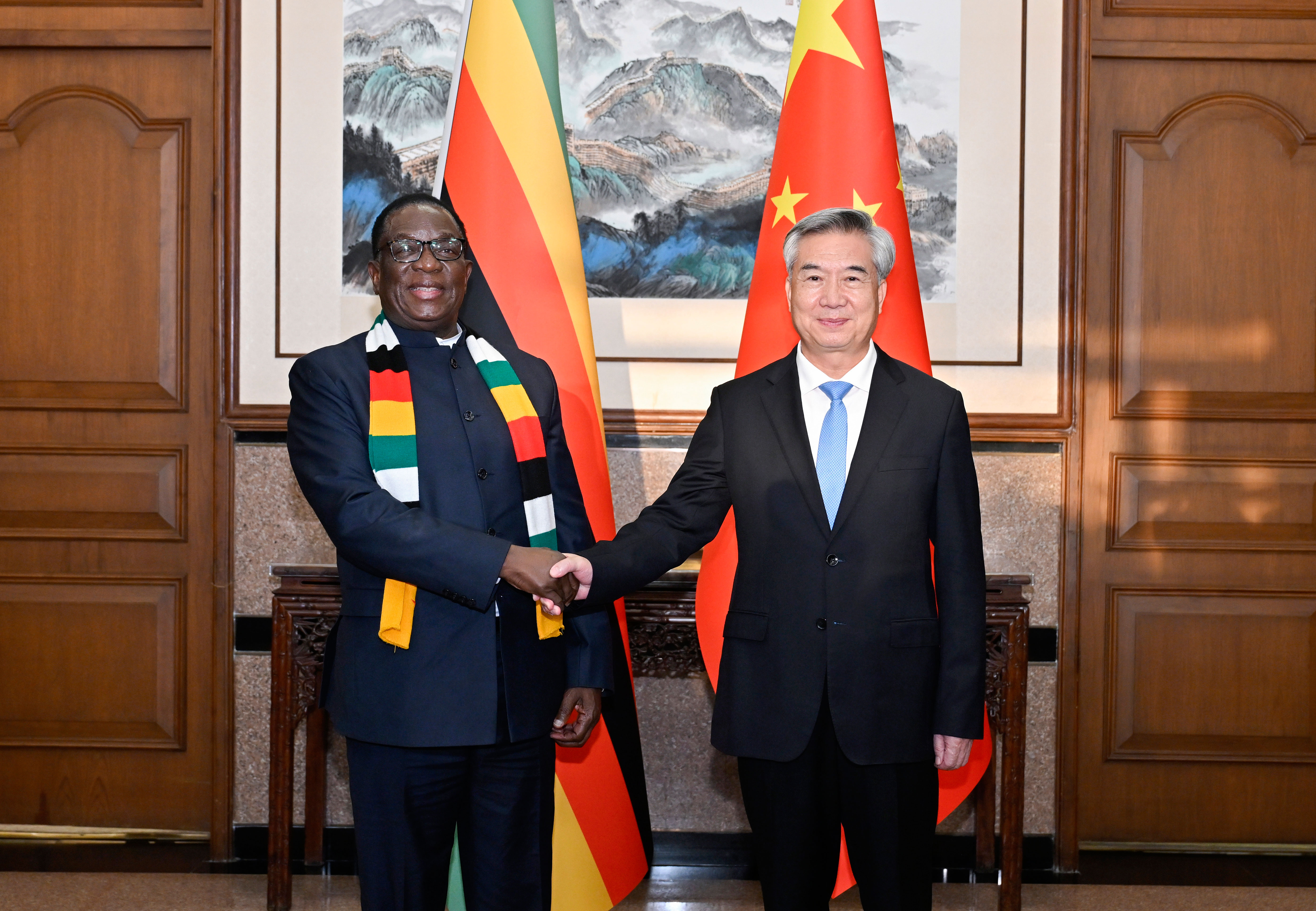 9月4日,中共中央政治局常委、中央紀委書記李希在北京會見來華出席紀念中國人民抗日戰爭暨世界反法西斯戰爭勝利80周年活動的津巴布韋總統姆南加古瓦。 新華社記者 岳月偉 攝