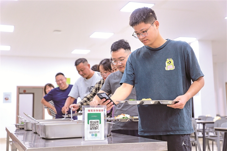 9月25日,在浙江省永康市方巖鎮人民政府食堂,下鄉走訪的干部正通過掃碼支付“公務餐”費用。 王暉 攝