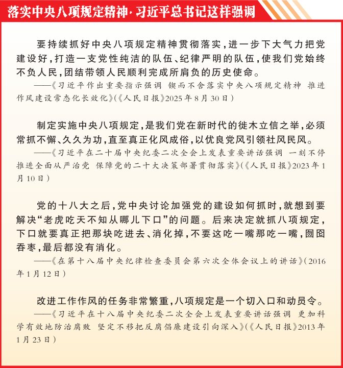 沒有規矩,不成方圓。9月25日,中央紀委國家監委公布了2025年8月全國查處違反中央八項規定精神問題匯總情況。當月,全國共查處違反中央八項規定精神問題26838起,批評教育和處理34480人,其中黨紀政務處分23547人,這是連續第144個月公布月報數據,傳遞出紀檢監察機關常態長效深化落實中央八項規定及其實施細則精神、一嚴到底糾治“四風”的強烈信號。紀檢監察機關要自覺把思想和行動統一到黨中央決策部署上來,緊緊圍繞二十屆中央紀委四次全會部署,堅持以“永遠在路上”的執著和“抓鐵有痕”的韌勁,不斷加固中央八項規定堤壩。
