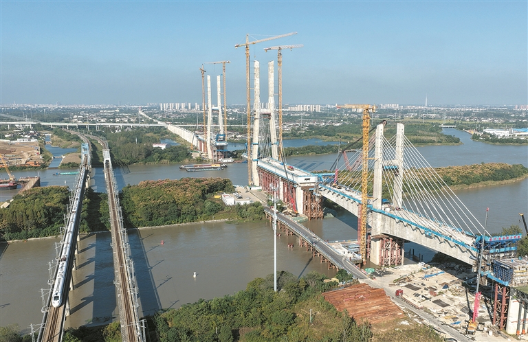 滬渝蓉高鐵是國(guó)家“十四五”期間推動(dòng)的重大基礎(chǔ)設(shè)施項(xiàng)目。圖為10月9日,在江蘇省揚(yáng)州市,滬渝蓉高鐵跨京杭運(yùn)河斜拉橋建設(shè)現(xiàn)場(chǎng)一派繁忙景象。