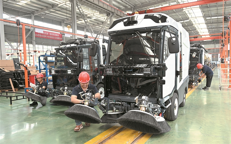 圖為10月2日,在湖南省洞口縣一家機(jī)械制造企業(yè),工人在生產(chǎn)新能源環(huán)衛(wèi)車。 圖片來(lái)源:視覺中國(guó)