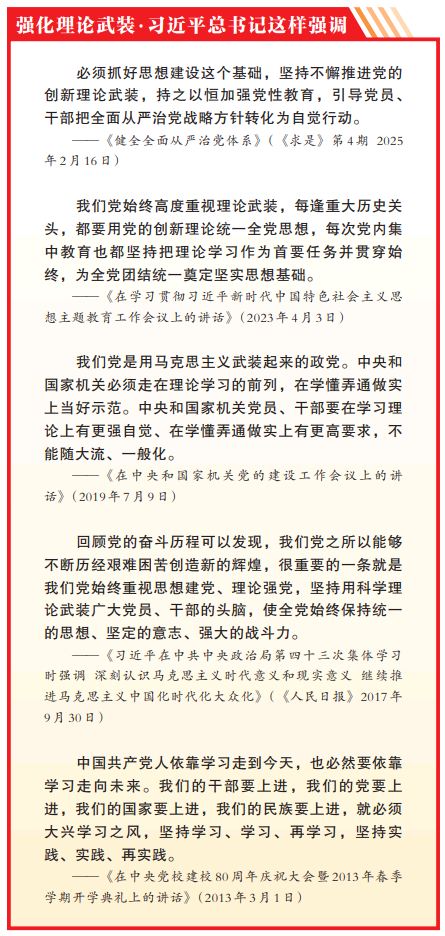 注重思想建黨、理論強黨,是我們黨的鮮明特色和光榮傳統。新征程上,廣大黨員干部只有堅持不懈強化理論武裝,始終保持政治上的清醒和堅定,自覺在思想上政治上行動上同以習近平同志為核心的黨中央保持高度一致,才能更好面對更為艱巨的歷史任務。作為黨的“紀律部隊”,紀檢監察機關始終把學習黨的創新理論擺在突出位置,持續發力,不斷強化理論武裝,筑牢思想堤壩,提升干事創業本領,努力做自我革命的表率、遵規守紀的標桿。