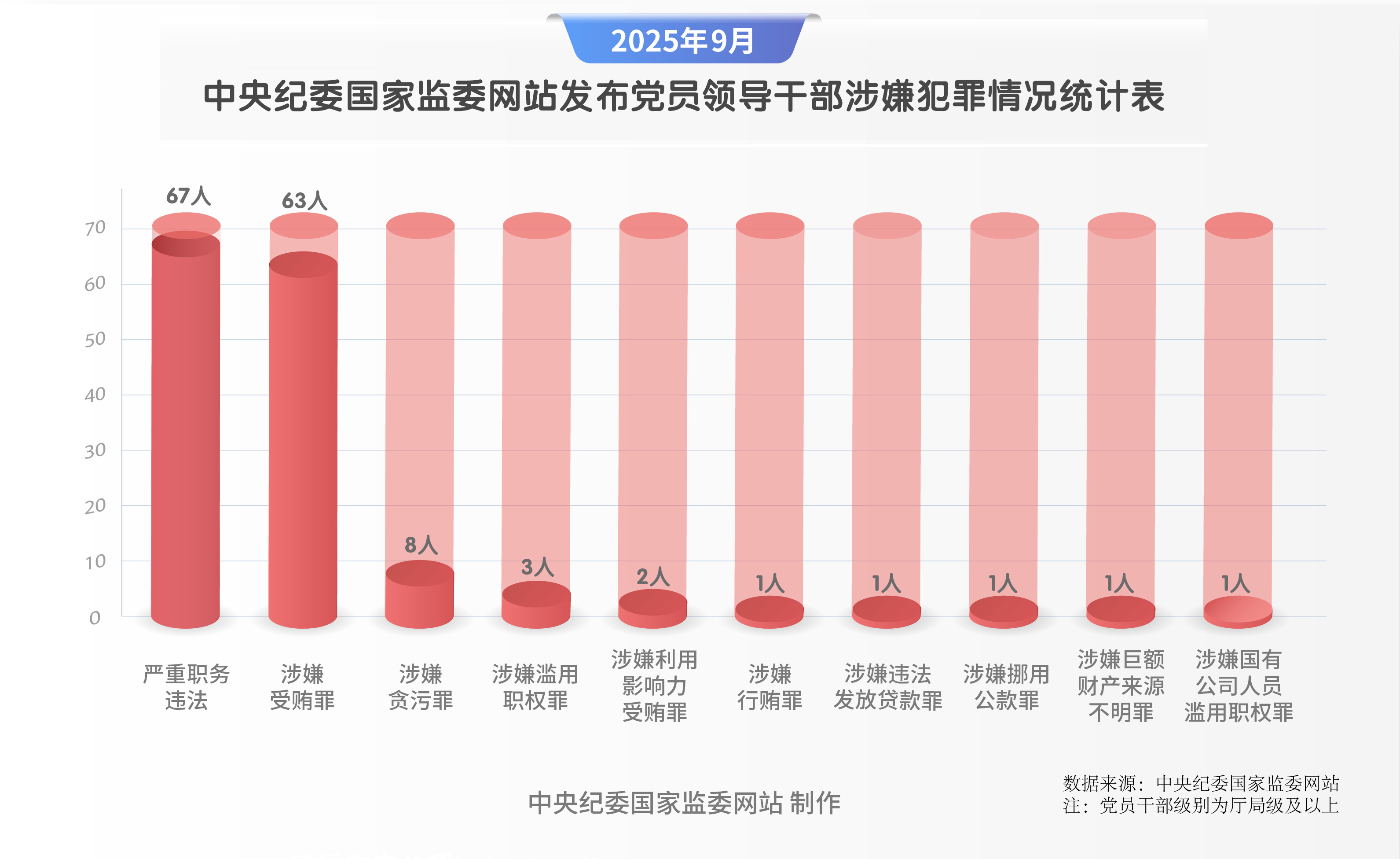 2025年9月,中央紀(jì)委國家監(jiān)委網(wǎng)站發(fā)布的黨紀(jì)政務(wù)處分信息中,67名被處分黨員、干部均構(gòu)成嚴(yán)重職務(wù)違法,63人被指涉嫌受賄犯罪,8人被指涉嫌貪污犯罪,3人被指涉嫌濫用職權(quán)犯罪,2人被指涉嫌利用影響力受賄犯罪,另外各有1人被指涉嫌行賄罪、違法發(fā)放貸款罪、挪用公款罪、巨額財產(chǎn)來源不明罪、國有公司人員濫用職權(quán)罪。