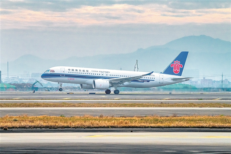 圖為一架南航C919國產大飛機在廣州白云國際機場起飛。 新華社記者 王瑞平 攝