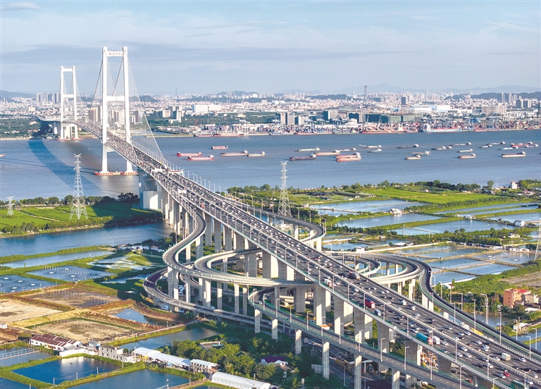 圖為廣東南沙大橋上的車流和獅子洋水道的船舶來來往往。 新華社記者 劉大偉 攝