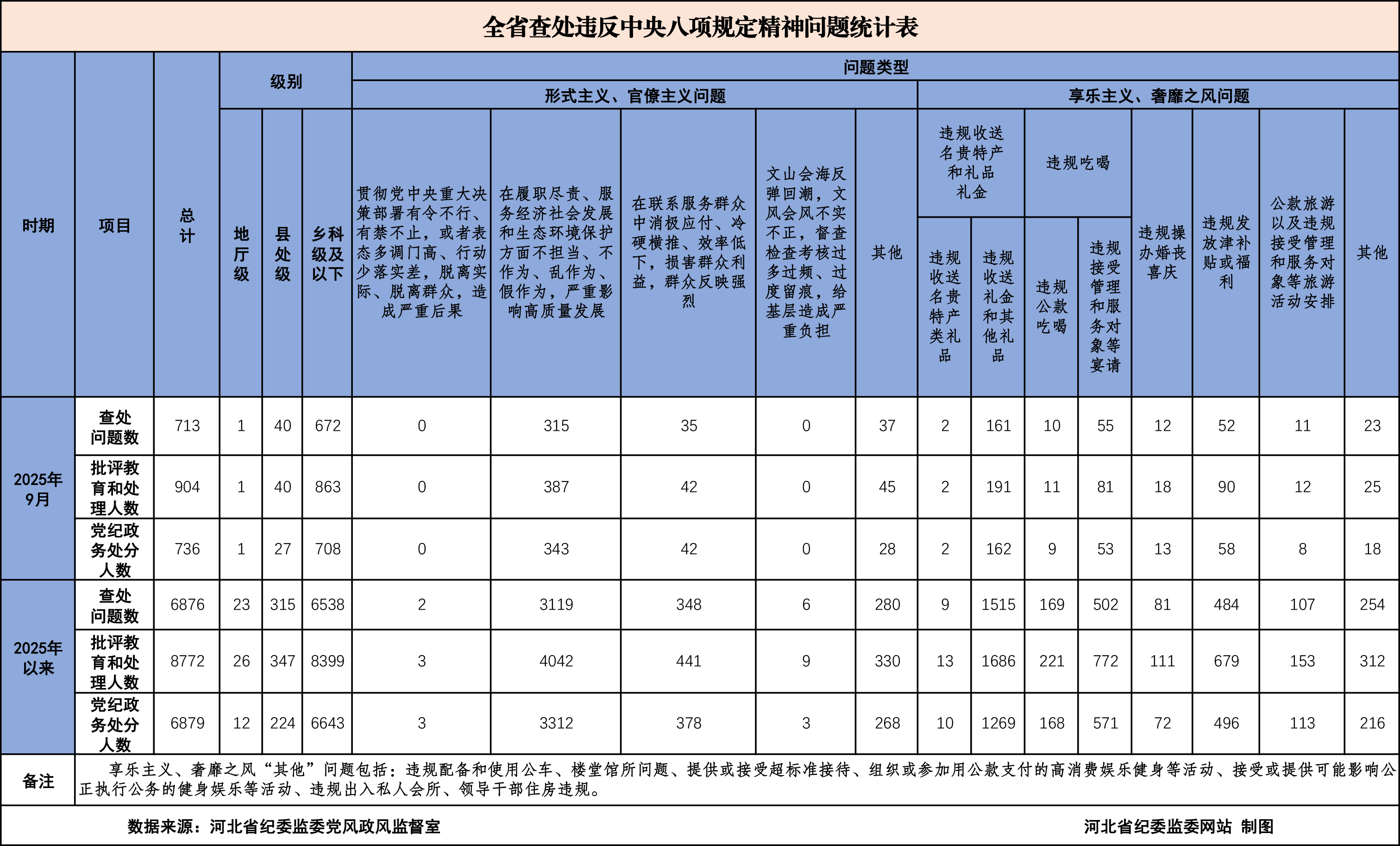 今年9月,全省共查處違反中央八項規定精神問題713起,批評教育和處理904人,其中黨紀政務處分736人。