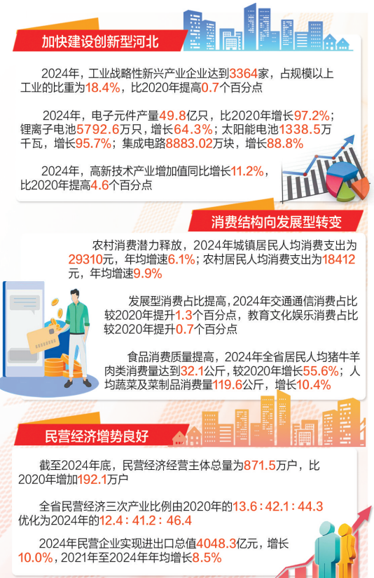 2024年,國家級專精特新“小巨人”企業達到409家,比2020年增長2.8倍;截至2024年底,民營經濟經營主體總量為871.5萬戶,比2020年增加192.1萬戶;2024年,全省社會物流總額為9.3萬億元,物流業總費用與地區生產總值的比率為14.0%,為歷年來最低水平……這張“十四五”沉甸甸的成績單,彰顯了河北高質量發展成色。