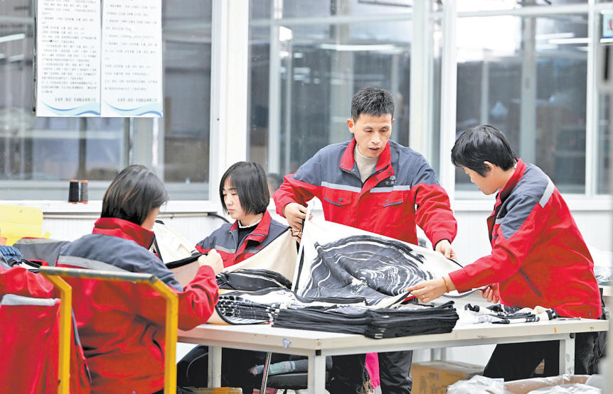 11月14日,安美橋(南宮)羊絨制品有限公司首席質量官趙建軍(右二)在檢查羊絨圍巾質量。本報記者 趙永輝攝