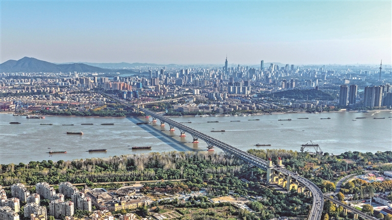 水運連著國運,江河滋養文明。黨的十八大以來,以習近平同志為核心的黨中央以長江、黃河兩大流域發展戰略為主體架構,將經濟社會高質量發展和生態環境高水平保護相結合,在實踐中不斷完善和發展新時代江河戰略。圖為近日拍攝的長江南京段和南京長江大橋,江面百舸爭流,江畔美景如珠鏈鋪展(無人機照片)。 新華社記者 李博 攝